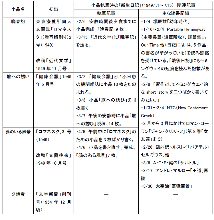 いろいろな作品を通して、福永が自らの理想とするイデア小説の執筆へと邁進していく姿をあらためて想像し、たいへん有意義な例会であったと感じました。 Su氏:「小品四種」感想 今回もKiさんのレジュメとそれに基づく発表には大いに学ぶところがあった。いつもながら要点が簡潔にまとめられてわかりやすく、納得させられる。また、Miさんの『電子全集』解題や例会内での様々なご指摘に教えられ、改めて気づかされる点も多々あり、福永の小品の魅力を再認識することとなった。 お二人の示唆に富む言及を踏まえながら、例会前後に考えたことを以下に書き留める。 1.四つの「小品」について *初出は「晩春記」「旅への誘い」「鴉のいる風景」が1949年、「夕焼雲」は1954年で、以降長い時を隔て、1969年刊行『幼年 その他』に「四つの古い小品」と題されて発表される。 *福永作品で、自ら「小品」と規定して発表したものはこれら四つ以外ない。 福永の「小品」に対する考え方は、Miさんがあげておられるように、『意中の文士たち 下』に収録される堀辰雄の「小品」に対する言及がそのまま当てはまるだろう。すなわち、「すぐれた小品は(A)小説に近いもの (B)散文詩に近いもの この二つ親近性によって、微妙に詩と小説の間に位置し、作者の文體に於て一種の流動するものを持ってゐることが要求されなければならない。(中略)その作品の発想の中心部には常に一つ(または一つ以上)の凝縮された詩的感情、心理的風景、或はIdyllがある。」という特徴があげられる。 *この当時の福永の置かれていた状況を確認しておく。1947年11月清瀬の国立東京療養所に入所し、先行3作品が制作された49年当時も、重篤な状況は脱しながらも退所の目途は立たず、経済面も含めて厳しい状況が続いている。49年は正月から7月まで「日記」が残されており、2012年刊行された『福永武彦新生日記』に「小品」の制作状況も含め、生活の様子をかなり詳細にたどることが出来る。前年末に妻澄子から離婚の話を切り出され、前途に明るい展望も見出せず、新年早々から「死」や「不眠」の記述が散見される。そのような中で執筆されたのが先の3作品である。 また、Kiさんがレジュメで書かれているように、「日記」によると、当時多くのヘミングウェイ作品を読んで感銘を受けている。1月16日には「Portable Hemingweyを読む。」とあり、1月21日には「H.の短編集In Our Timeを読んでゐる。誰でも書ける(筈の)文体。一短編に於ける世界の構成(現実の再現ではない、再構成されたもの)。明かな主題。常に抑圧された感情と批判。可視的。もしこれで今一層内部世界が描かれたら完璧だと思ふ。またそこに後から来る者に残された道がある。H.とフランス心理小説との綜合(F.に多少その方向を見る)。意識面もまたH.の外部世界と同じやうに物として描かれることが出来る筈だと思ふ。」という記述も見える。 ヘミングウェイに刺激を受け、それを実験的に短編に作品化を思い立つも、フィクション化するには療養所生活でその素材を見出すことも難しいし、また、体力的にも厳しい。そこで、師堀辰雄が、自らの健康面の不安と向き合いながら、味わい深い「小品」を書いたことに習ったのではないだろうか。フィクション性は乏しいが「微妙に詩と小説の間に位置し、作者の文體に於て一種の流動するものを持ってゐる」「小品」という形式で、実験を行ったのがこの三つの作品ということだろう。 2.各小品について ①「晩春記」 *昭和20(1945)年5月12日から7月7日までの帯広療養所入所中の話。 *『新生日記』、49(昭和24)年2月6日に「安静時間後夕食までに小品完成。「晩春記」九枚。」とある。「日記」によれば、4,5,6日の三日間で書き上げている。1月31日に「ロマネスクのための散文詩も気が進まない。」とあるので、初めは散文詩を書く予定でいたものと思われる。 *先にも書いたが、この時期の福永は「死」「自殺」「孤独感」にさいなまれてしばしば「不眠」に苦しんでいる。そういう中で、この穏やかな印象の作品が成ったことに注目する。1月25日に「もし文学が人間を救ふことが出来るならば、それは一人の人間をまづ救ふことが出来る筈だと思ふ。」と書く福永であってみれば、書くことで自らが救われたいという思いがあったのではないか。このころ親しくなった療養所女性入所者飯原栄の、手術後の個室を訪ね、3月13日にこの「晩春記」を読んであげているのも、自分の書いた「文学が人間を救ふ」ことを信じてのことだったように思う。因みに翌14日には「聖書」、「ヨブ記」の一節を読んであげている。 ②「旅への誘い」 *前半は澄子との結婚前の昭和19(1944)年、藤沢に下宿し、日本放送協会に勤務していたころの話。後半は昭和22(1947)年6月、再度の帯広療養所入所時の思い出。二つの時間を対比させて描く。 *稿が成ったのは49年3月7日。「日記」に「午後の安静後に小品「旅への誘いひ」十四枚。」 *対比的に描かれた二つの時間。一つは